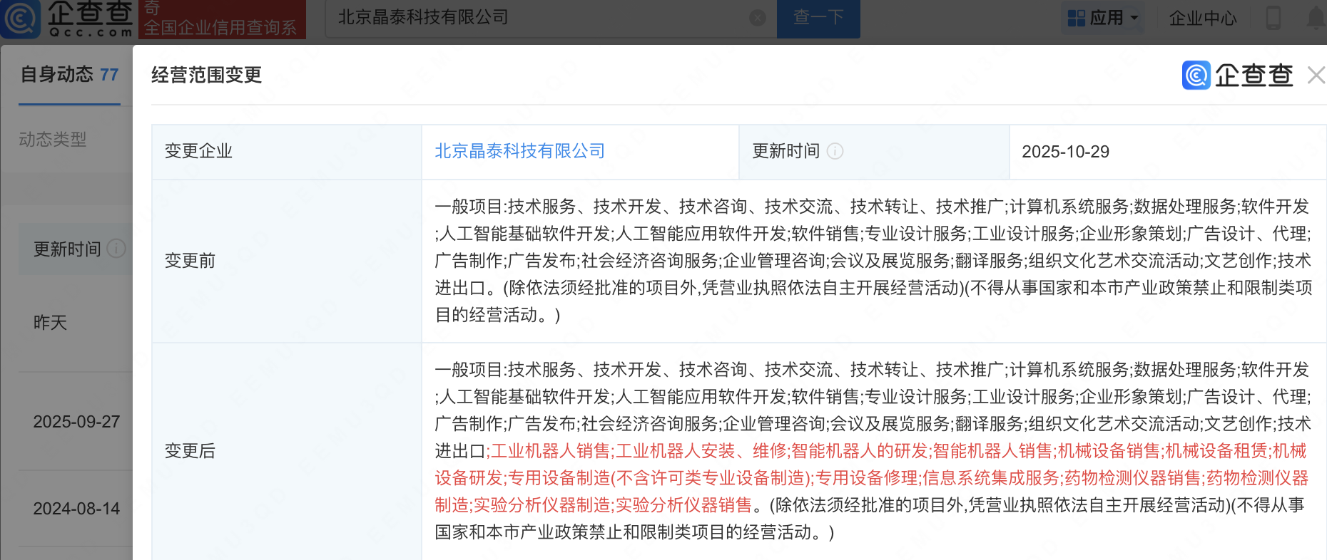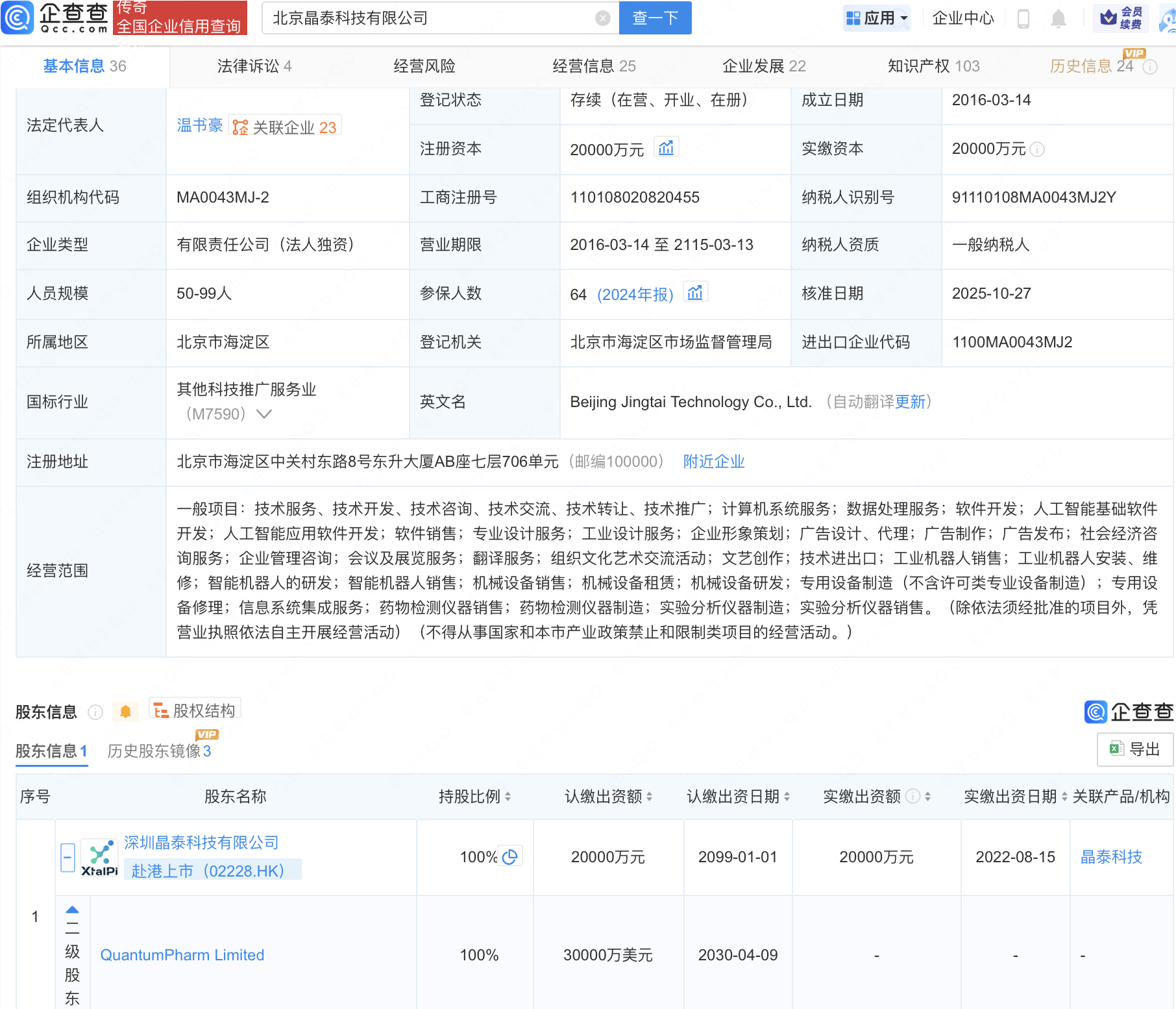 近日,北京晶泰科技有限公司发生工商变更,经营范围新增工业机器人销售;工业机器人安装、维修;智能机器人的研发;智能机器人销售等。企查查信息显示蔚莱策略,该公司成立于2016年,法定代表人为温书豪,由深圳晶泰科技有限公司全资持股,后者由QuantumPharmLimited全资控股。
